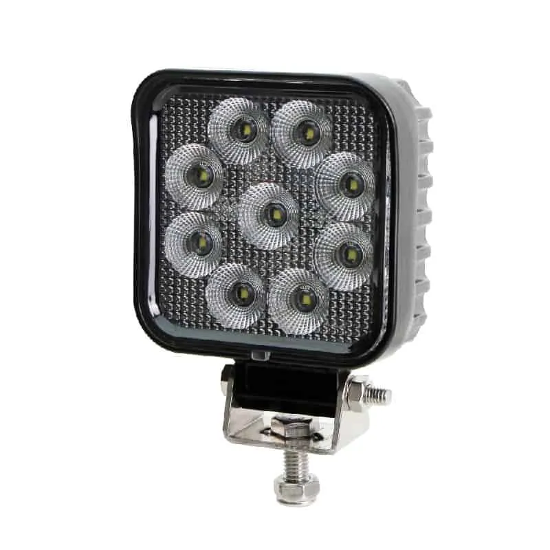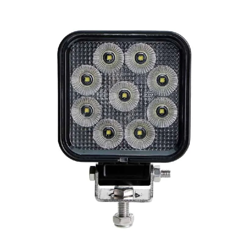 3.6inch Square High Powered LED light. 9 x 3 Watt high power Cool White LEDs. 9~32VDC operating voltage range, IP67 waterproof light. Black painted aluminum housing with integral heatsink and acrylic lens. Available in narrow 30 degree or medium flood 60 degree beam pattern. Stainless steel adjustable stud mounting bracket and optional mounting tabs included.