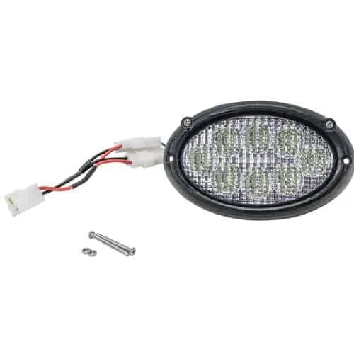 Oval LED Flush Mount Cab Light. This light is Plug & Play LED light for Challenger & Massey Ferguson tractors. Uses original mounting bracket on tractor. Comes with stainless steel hardware and connectors. Light comes with two connectors to work on lights that have two bulbs in one housing, as well as an adapter to work on single bulb lights.